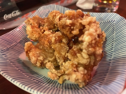 鶏のから揚げに、しょうゆベースのタレがかかってます。