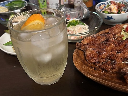 メニューはビールの横から、鶏のから揚げ・アスパラバター焼き・のらぼう菜・タコとキュウリの梅肉和え・大根とカニカマのサラダ