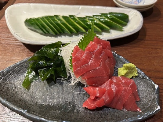 生本まぐろの赤身とキュウリの一本漬け