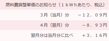 去年の3月燃料費調整額は、1kwhあたり-8.83円で、約-3,823円でした。