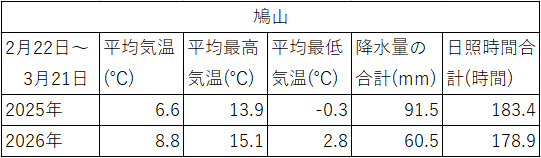 毛呂山町の隣町の鳩山町には、気象庁の観測所がありますので、去年と今年の2月22日~3月21日までの28日間の気温などを表にしてみました。