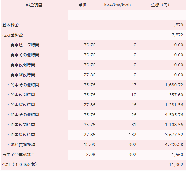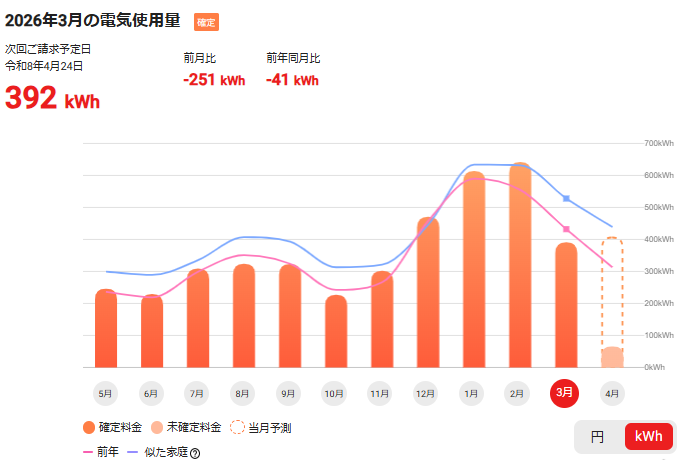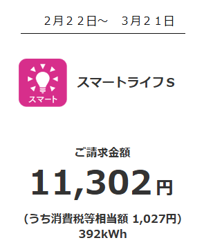 今年の3月分は、28日間で392kwh使って11,302円でした。