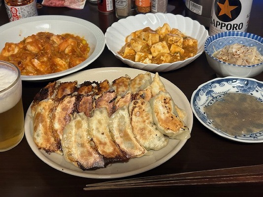 メニューはビールの横から、餃子・新たまマリネ・麻婆豆腐・エビチリ