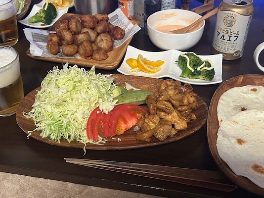 メニューはビールの横から、タコスセット・ブロッコリー・ユズのはちみつ漬け・サトイモのから揚げ