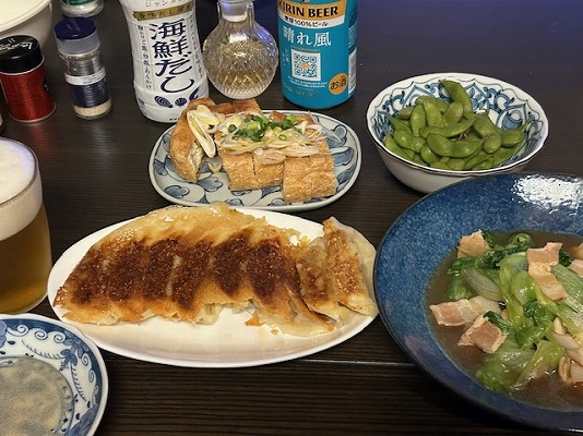 餃子は、スーパーで売ってた箱入りの肉餃子。 まーまー美味い。