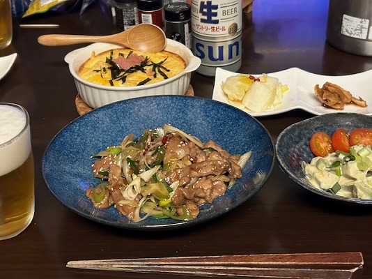 メニューはビールの横から、豚肉とネギのピリ辛炒め・アボカドサラダ・ごんじり・白菜漬け・明太ポテトグラタン