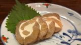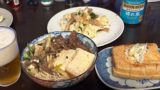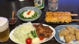 メニューはビールの横から、カニクリームコロッケ・ウズラフライ・八つ頭の煮物・玉こんにゃく・紅大根漬け