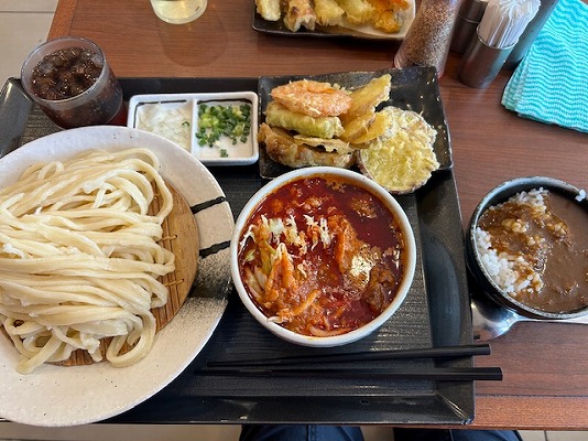 コチラが、あま辛汁うどんとカレーライスに天ぷら