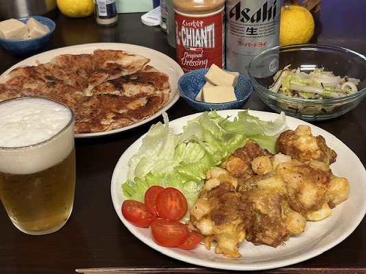 メニューはビールの横から、長芋と豚肉のカレーから揚げ・白菜サラダ・高野豆腐・すりおろしレンコン焼き