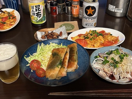 メニューはビールの横から、海老寄せ春巻き・タコ刺しごま油・トマト卵炒め・味付けナッツ