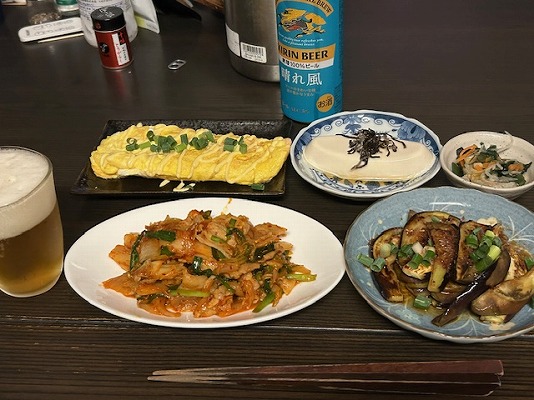 メニューはビールの横から、豚キムチ炒め・焼きナス・ニシン漬け・冷やっこ塩昆布載せ・明太厚焼き玉子