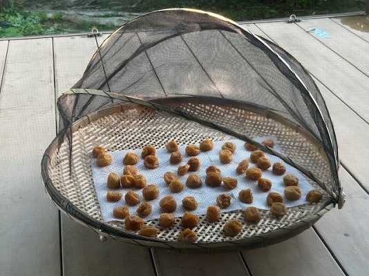 お散歩から帰って昼食後、妻は今年の梅干を干してました。