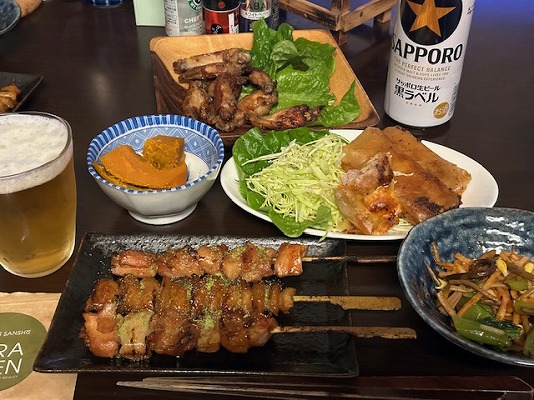 今日は、スーパーの総菜の焼き鳥(ねぎま・鶏皮・もも)で、ぶどう山椒を掛けるとうまい!