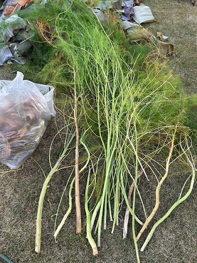 アスパラは、葉の茎がしなやかで丈夫なので、クルクル巻いて玉状にしてゴミ袋に入れれば茎でビニールを破ることは無く捨てられます。
