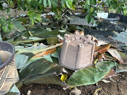 バナナ葉は、レモンの木の霜対策でレモンの木の下に敷き詰めることにしました。