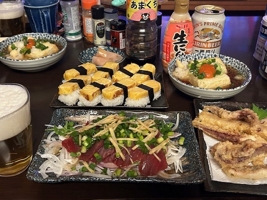 メニューはビールの横から、カツオのたたき・する天・揚げ出し豆腐・玉子寿司