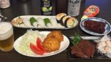 メニューはビールの横から、ナスとピーマンと豚肉の味噌炒め・冷ややっこ塩昆布載せ・オクラと卵の中華炒め・海老アボカド寿司・ミニトマトのドレッシング漬け