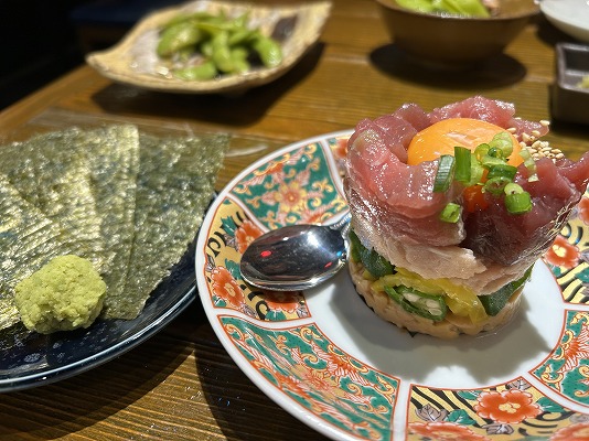この店の三大名物と書かれている仙台鬼ねぎ牛たん極み寿司と、海鮮爆弾タワーをオーダー