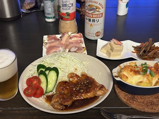 メニューはビールの横から、トンテキ・じゃが明太チーズ焼き・きんぴらごぼう・高野豆腐・イチジククリチ生ハム