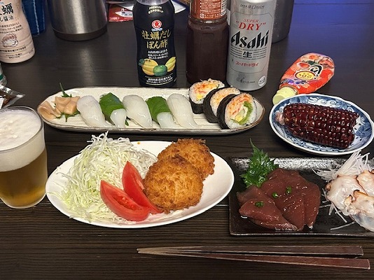 メニューはビールの横から、カニクリームコロッケ・マグロの青唐づけ・水だこ刺し・トウモロコシ・太巻きとイカ寿司