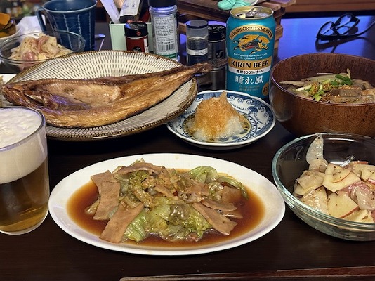 メニューはビールの横から、ベーコンとレタスのオイスターソース炒め・生ハムとリンゴのマリネ・芋煮・ホッケ