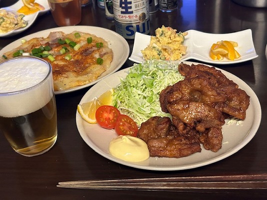 メニューはビールの横から、豚肉のから揚げ・ユズのはちみつ漬け・ポテサラ・モチのベーコンチーズ焼き