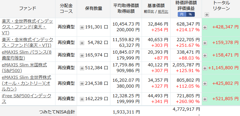 投資信託全てのトータルリターンは、12,962,655 円