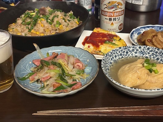 メニューはビールの横から、鴨ねぎ焼き・モチ巾着・大根のピリ辛煮・スパニッシュオムレツ・ステーキピラフ