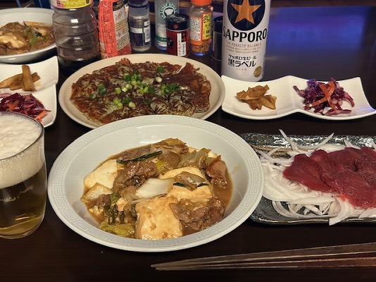 メニューはビールの横から、中華風肉どうふ・馬刺し・赤キャベツのマリネ・ごんじり・大根餅