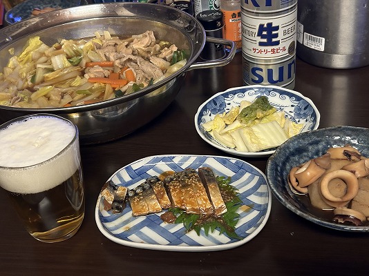 メニューはビールの横から、ごまサバ・イカと里芋の煮物・白菜漬け・白菜と豚肉鍋