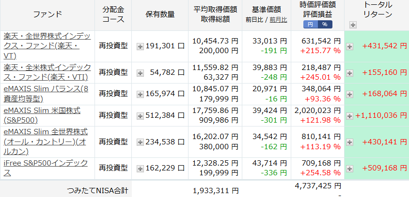 投資信託全てのトータルリターンは、12,693,922 円