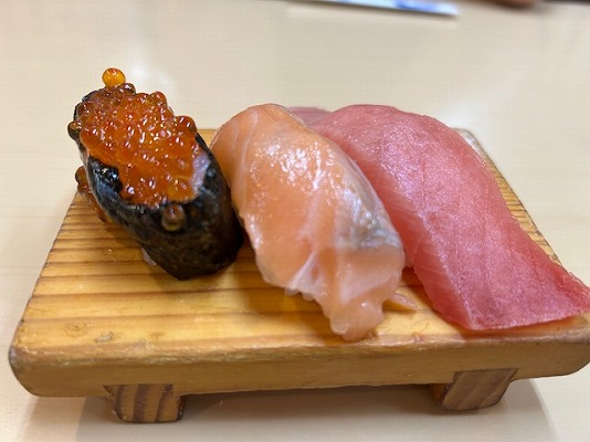 中トロ。サーモン・いくらの3貫がタダでいただけました。