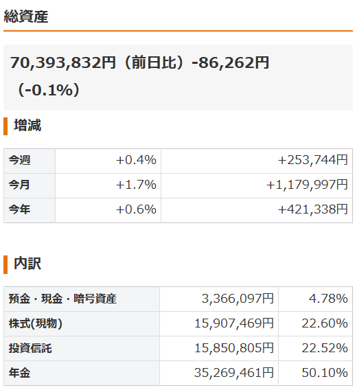ちなみに、iDeCoを含めた総資産で言うと、先月が約6,964万円で今月が約7,039万円なので、約75万円も戻しております。