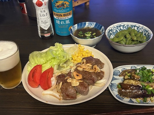 メニューはビールの横から、ガーリックステーキ・焼きナス・枝豆・もずく酢