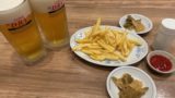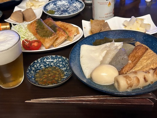 メニューはビールの横から、おでん・ゆず大根・えび芋煮・海老寄せ春巻き