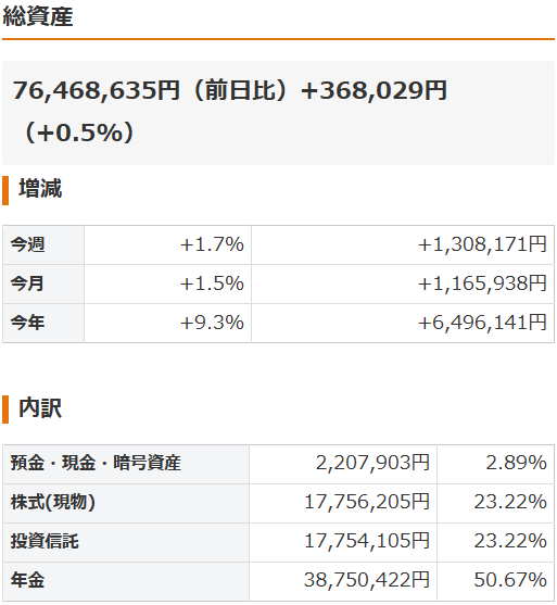 ちなみに、iDeCoを含めた総資産で言うと、先月が約7,496万円で今月が約7,647万円なので、約151万円も上げております。