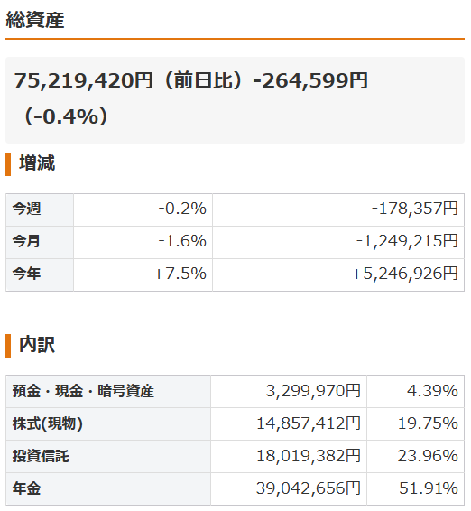 ちなみに、iDeCoを含めた総資産で言うと、先月が約7,647万円で今月が約7,522万円なので、約125万円も減っちゃいました。