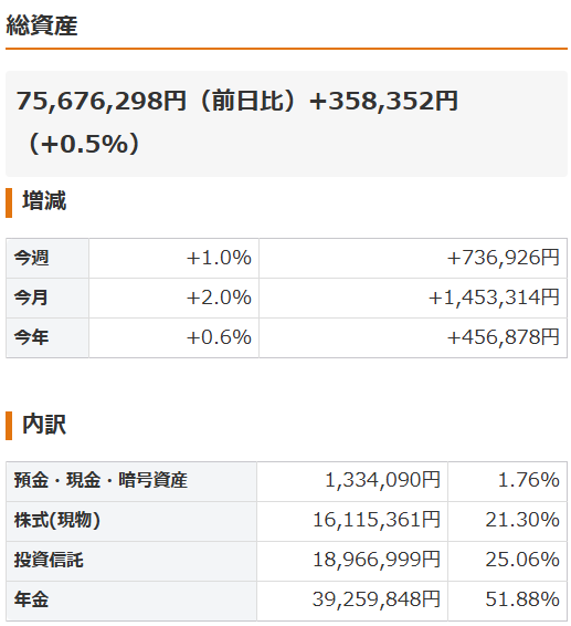 ちなみに、iDeCoを含めた総資産で言うと、先月が約7,422万円で今月が約7,568万円なので、約146万円も増えました。