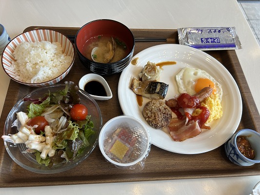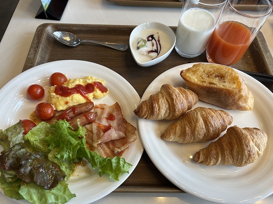 いつもは、素泊まりで地元の喫茶店などで食べることが多いのですが、今回は朝食付きだったので、ホテルのバイキング