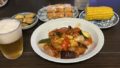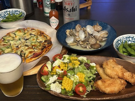 メニューはビールの横から、ささみチーズフライ・枝豆・あさりガーリックバター・ナスガーリックピザ