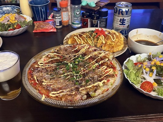 たこ焼きをタコ焼き器で作るのは、意外と面倒なのでお好み焼き風でイイよって言っときました。