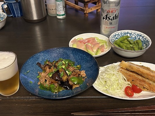メニューはビールの横から、ナスと豚肉の味噌炒め・ジャガイモと塩昆布の春巻き・枝豆・タイガーメロンの生ハム巻き