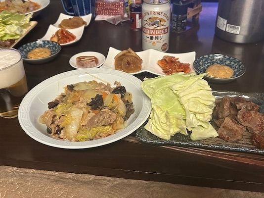 「あさひや」で豚のカシラ肉も購入したので、焼いてもらってニンニク辛みそでいただきました。