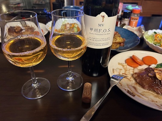 白ワイン用の甲州種を赤ワインと同じ製法で果皮ごと醗酵させたもの。
